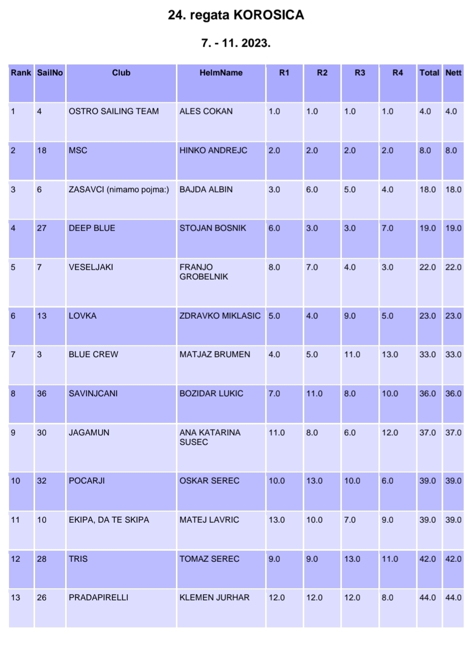Med 7. in 11. oktobrom 2023 smo odjadrali že 24. regato Korošica. Tokrat se nas je zbralo, po 5-ih letih, rekordnih 14. posadk oz. več kot 80 jadralk in jadralce, večina iz Koroške. Naša matična marina je bila spet Marina Hramina na Murterju in nam že dobro znane Bavarie 41C. Jadrali do Kornatov in nato na jug do Šibeniškega akvatorija.